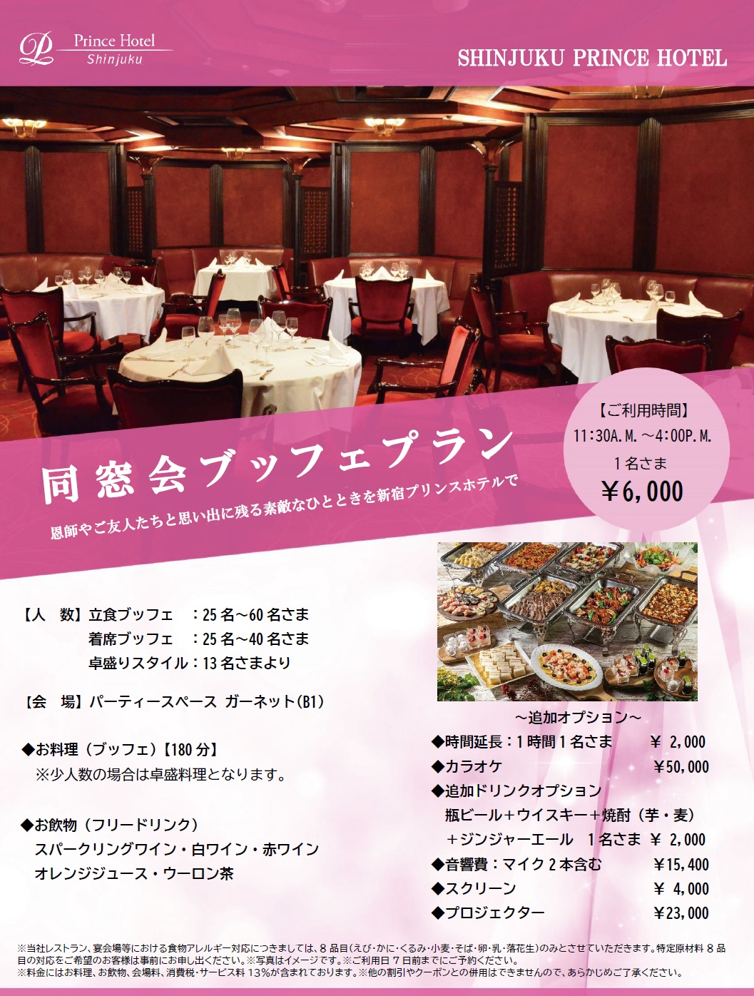 新宿プリンスホテル【パーティースペースGarnet】同窓会ブッフェプラン